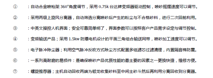 保节能,效率高,喷砂均匀,不容易变形,不走样,无斑马纹,喷砂细腻砂料自动循环使用,耗损低,生产
