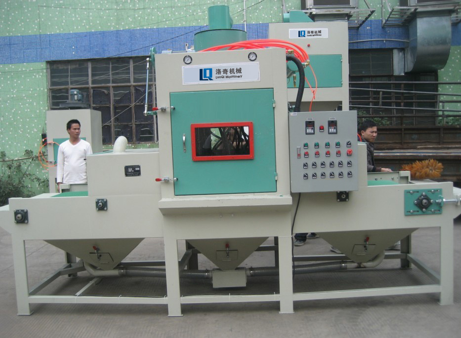 1、采用三角皮带输送工件,不会积砂,皮带速度配合喷砂工艺要求可实现变频调速; 2、每支喷枪角度可自由调节枪架实现自动变频摇摆并可定点喷砂,灵活性强; 3、采用先进的上旋风分离系统配置,粉尘分离效果好,喷砂效率高; 4、采用PLC电气先进控制系统,自动化程度高,稳定性好,故障率低; 5、喷嘴采用特制高耐磨碳化硼材料,使用寿命长; 6、独立的布袋式除尘系统,抽尘通风效果良好; 7、磨料回收采用螺旋输送及气力回收相结合,回收稳定行好。 适用范围: 适用于平板类、盘类、四方体、型材及其他异形工件的喷砂加工,如:平面不锈钢板材、并能钢板、玻璃钢板、石材、不粘锅、烤盘、多士炉、电脑机箱、功能DVD面板,笔记本、电脑主机板、电熨斗底板、装饰件、标牌徽章、通讯器材、铝板材、型材及其他异形件等。